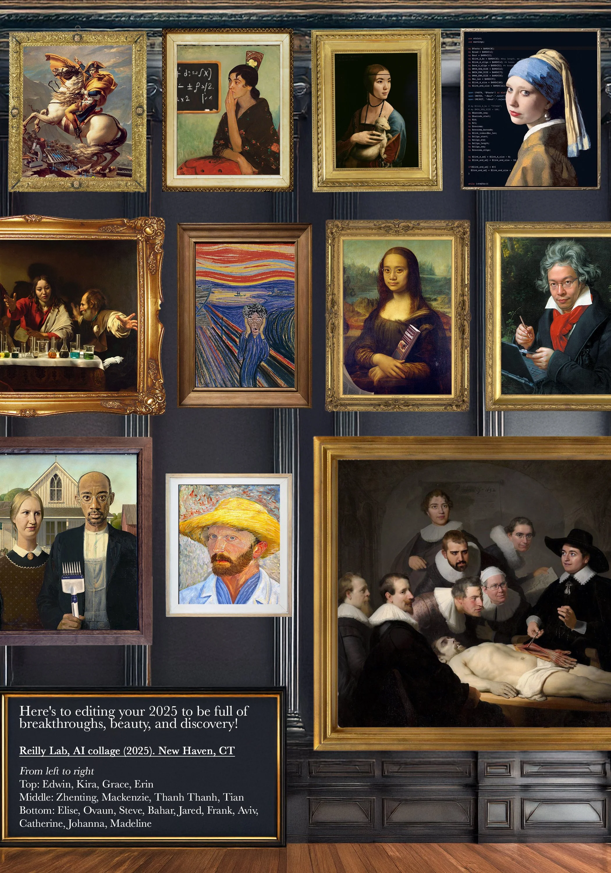 As we look to the blank canvas of 2025, the Reilly Lab is excited to share our annual New Year's card: "Mutated Masterpieces". Inspired by the fact small changes to our genetic code can lead to innovative outcomes, we decided to emphasize both the science and creativity that are critical for research. In our third year as a lab, we’re continuing to explore the genome’s 3.1 x 10^9 base pairs and how small mutations can have big impacts on our health, traits, and evolution. While this is a large search space, we know our work is enabled by a huge team of collaborators, mentors, trainees, funders, friends, family, administrators, and more, contributing in ways large and small. So thank you.